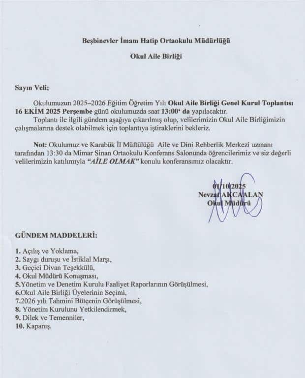 OKULUMUZ 2025-2026 EĞİTİM ÖĞRETİM YILI AİLE BİRLİĞİ OLAĞAN KURULU EKTEKİ GÜNDEM ÜZERE TOPLANACAKTIR.TÜM VELİLERİMİZİN BİRLİĞİMİZİN TOPLANTISINA KATILIMINI BEKLERİZ.